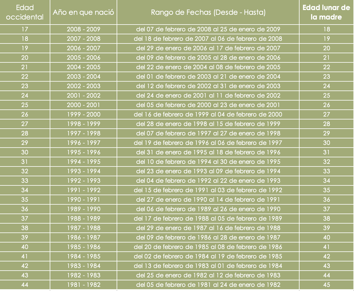 Tu Edad Lunar: En la tradición china, se considera que al nacer ya tenemos un año. Por eso, generalmente tu edad lunar es un año más que tu edad actual.